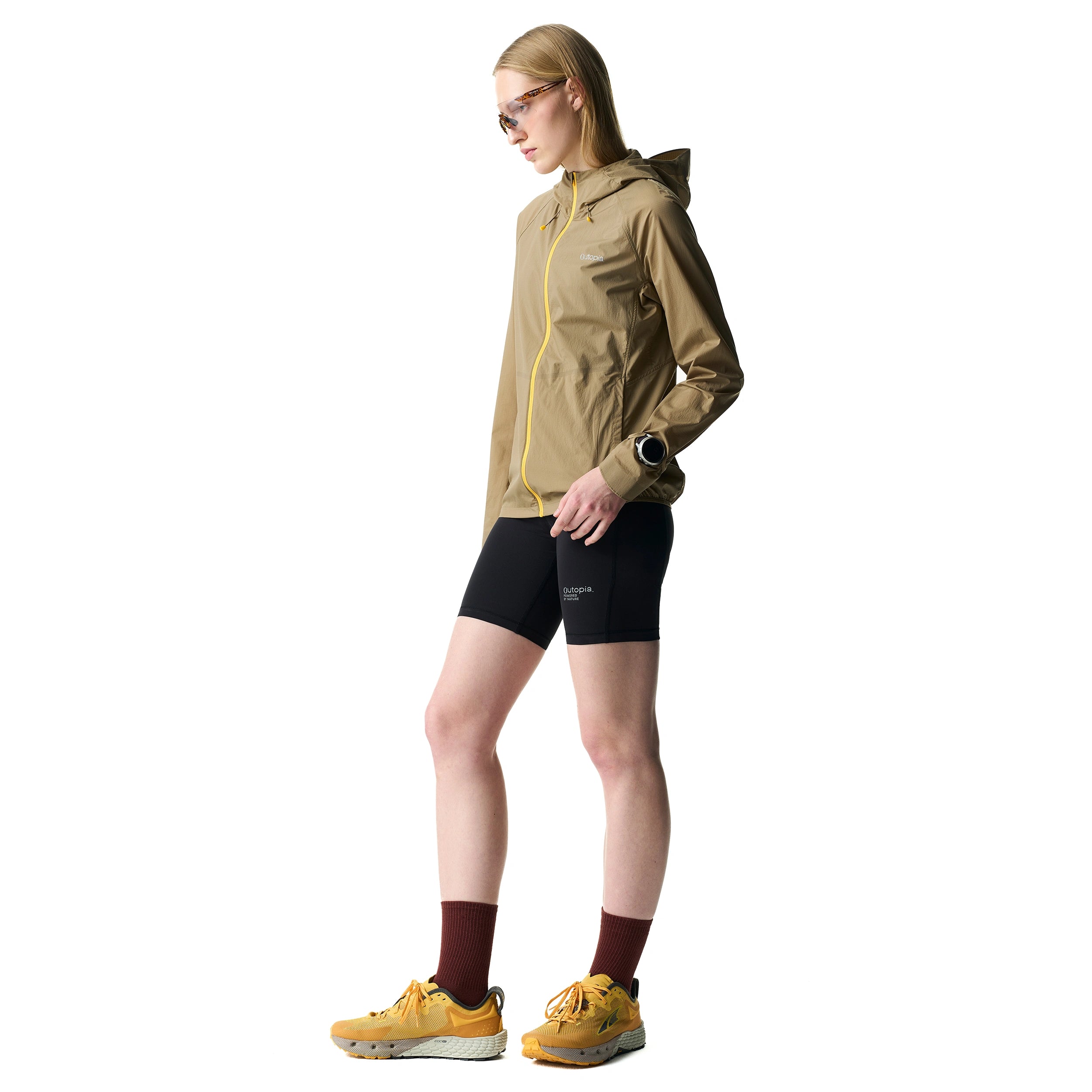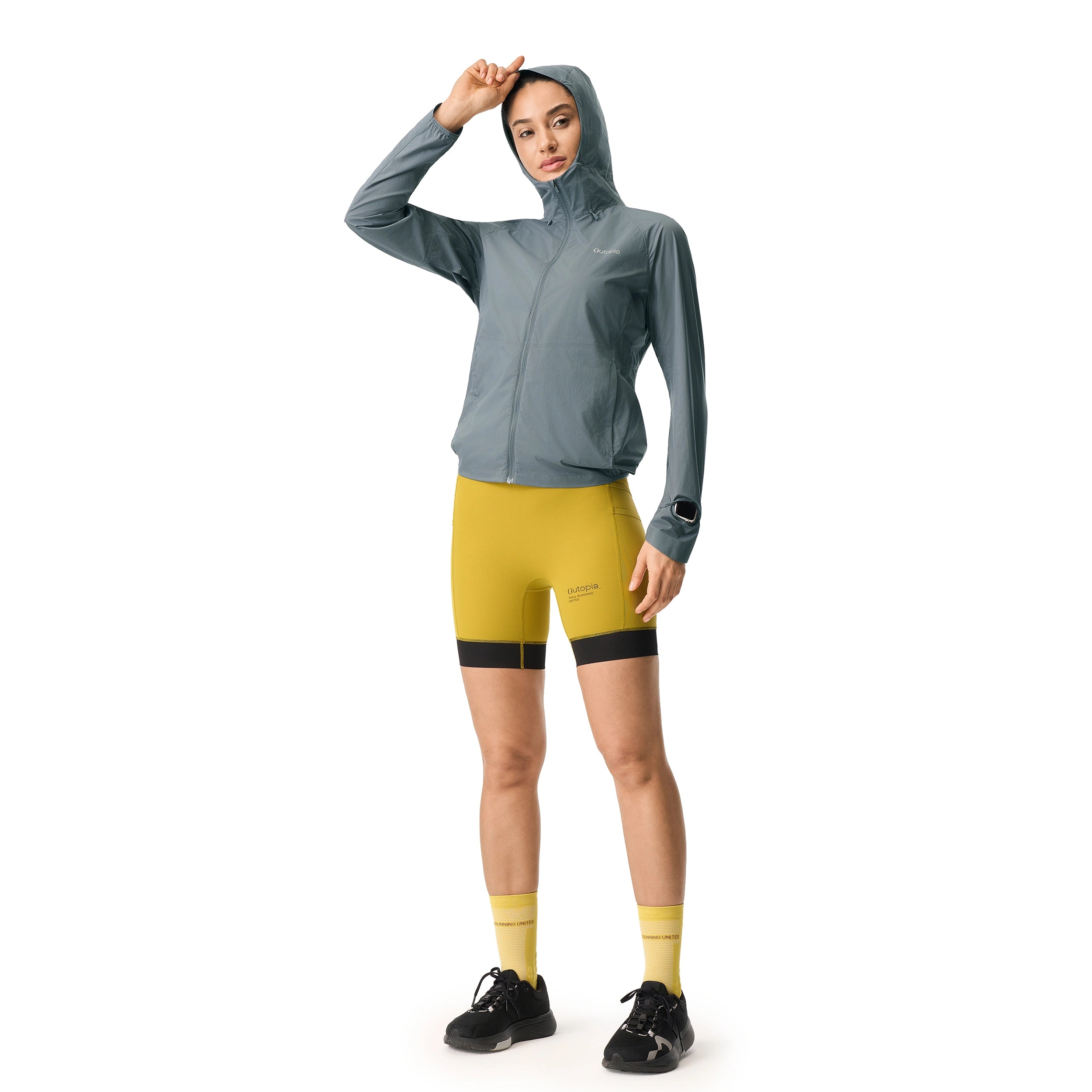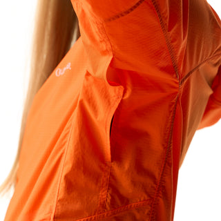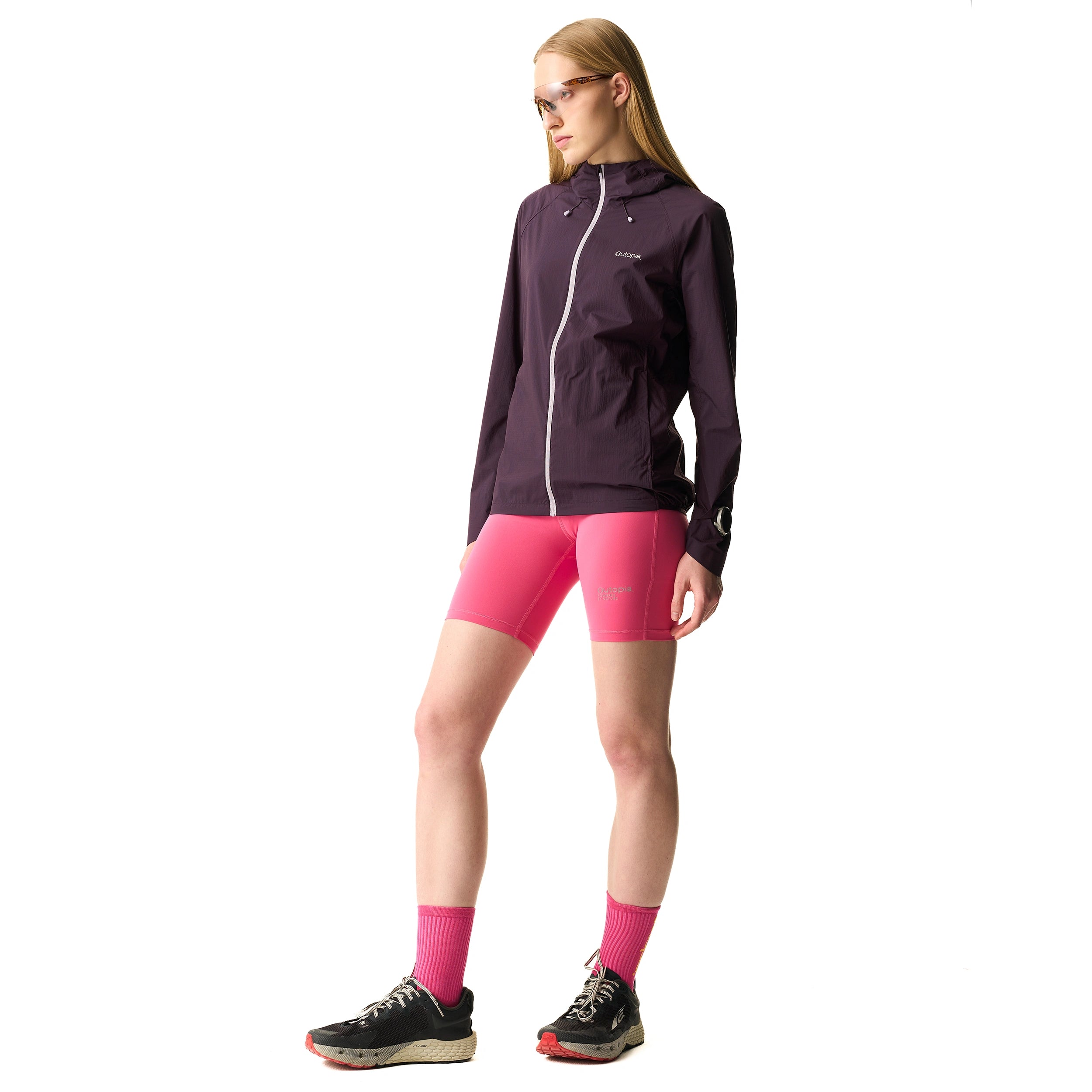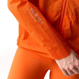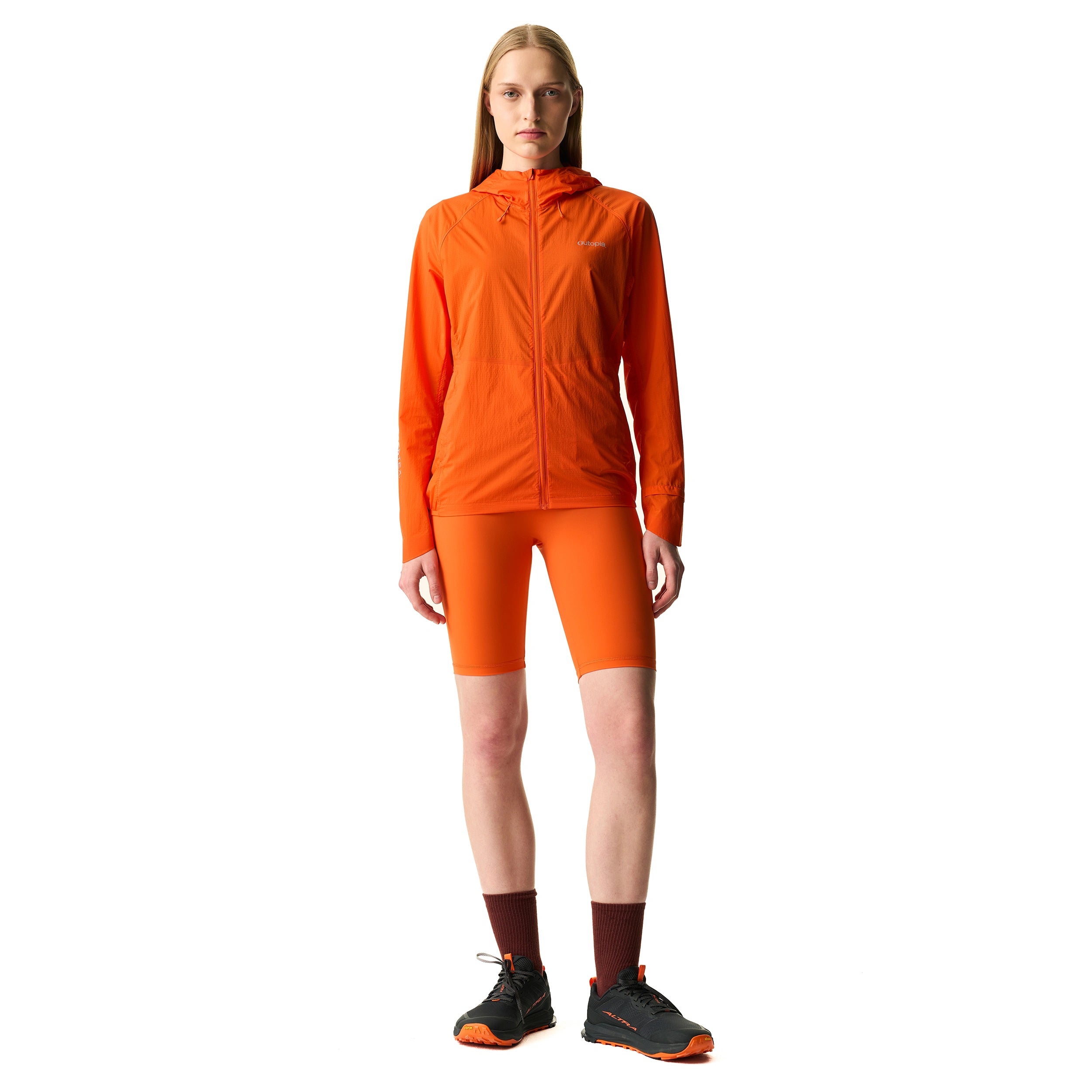 The design thoughtfully addresses the nuances of active motion: an adjustable hood with a ponytail hole offers a seamless fit, protective Horse-hoof cuffs, and an elasticized hem keeps the chill out. A dedicated watch window offers instant access to your data. Best of all, the entire jacket fits in its own pocket.